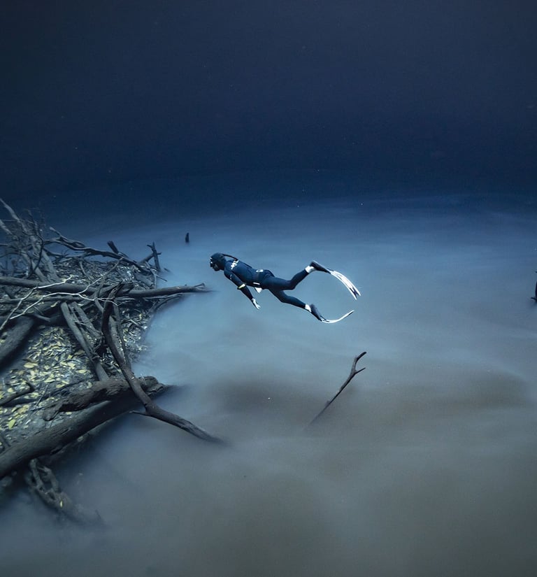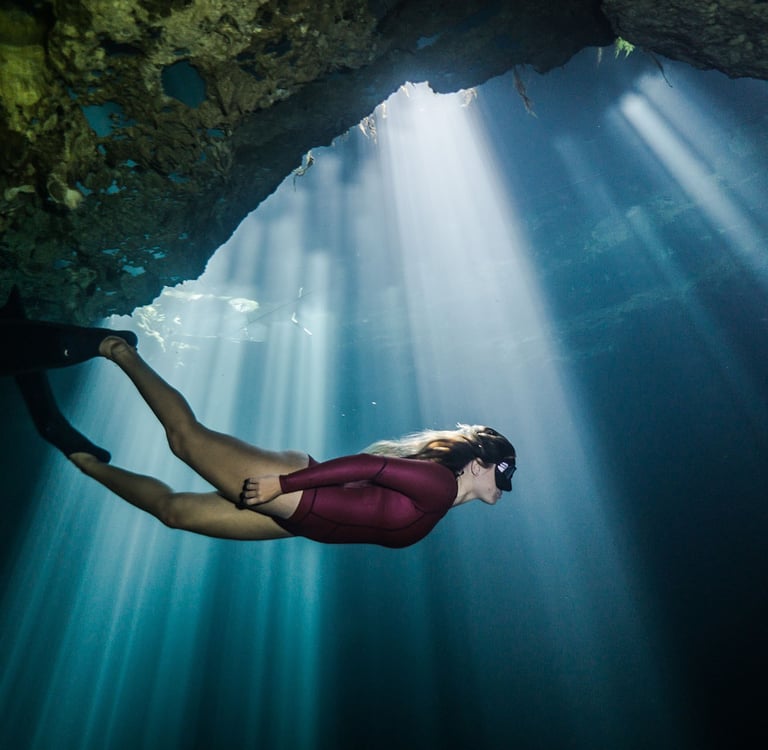 Les cénotes de la Riviera Maya offrent une expérience d’apnée à nulle autre pareille. Plonger dans ces cavités d’eau douce cristalline, entouré de formations rocheuses millénaires, est une immersion dans un monde mystérieux. Parmi les cénotes incontournables pour l'apnée, Angelita et El Pit sont remarquables pour leurs "nuages de soufre" à environ 30 mètres de profondeur, créant une atmosphère mystique que l'on ne retrouve nulle part ailleurs. Cependant, certaines restrictions d'accès peuvent s'appliquer, il est donc recommandé de se renseigner au préalable.