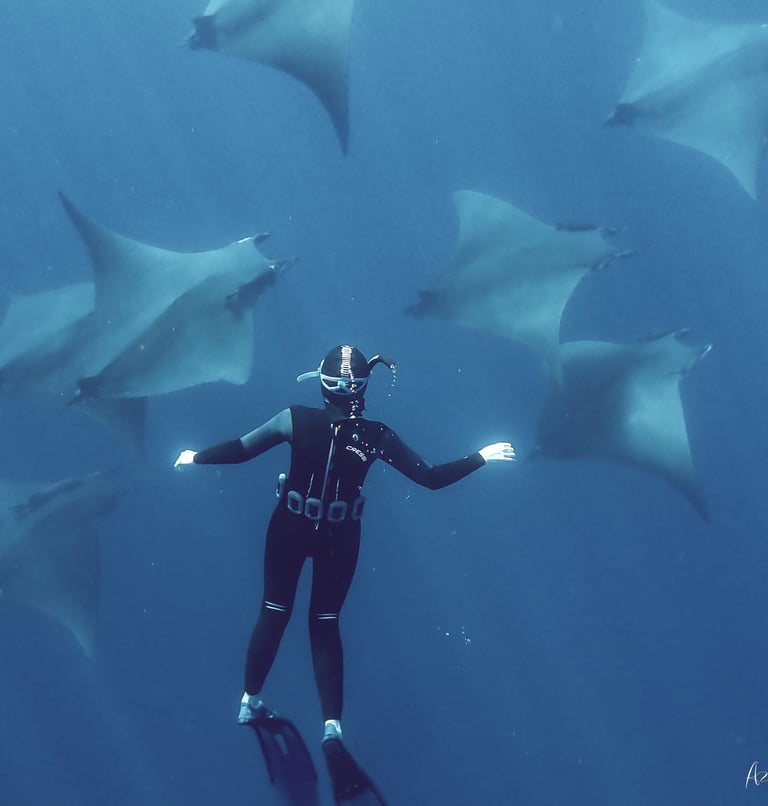 Les Açores, un archipel perdu en plein Atlantique, sont une destination de rêve pour les amoureux de la faune marine. Nager aux côtés de raies mobulas en pleine nature, observer des cachalots et dauphins ou aller à la rencontre des requins-peau bleue fait partie des expériences magiques qu’offrent ces îles. Les Açores sont également riches en reliefs volcaniques sous-marins, qui ajoutent une dimension spectaculaire à vos plongées. La diversité de la faune marine et les grands espaces de l'océan Atlantique en font un spot à ne pas manquer pour les apnéistes.