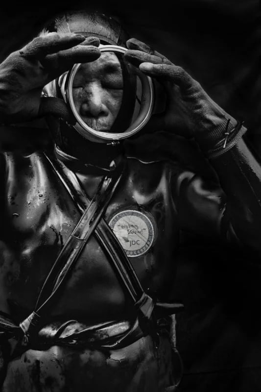 Ces sublimes portraits de grand-mères de la mer, comme il les a intitulés, sont l'œuvre du photographe Alain Schroeder. Il a réalisé ces photographies en noir et blanc, car il trouvait visuellement intéressant le contraste noir sur noir des combinaisons avec les rochers volcaniques lors de ses premiers clichés. Il a ainsi eu l'idée de tirer le portrait de ces femmes sur fond noir, pour que la matière des combinaisons lisses et mouillées offre un résultat magnifique à la lumière.